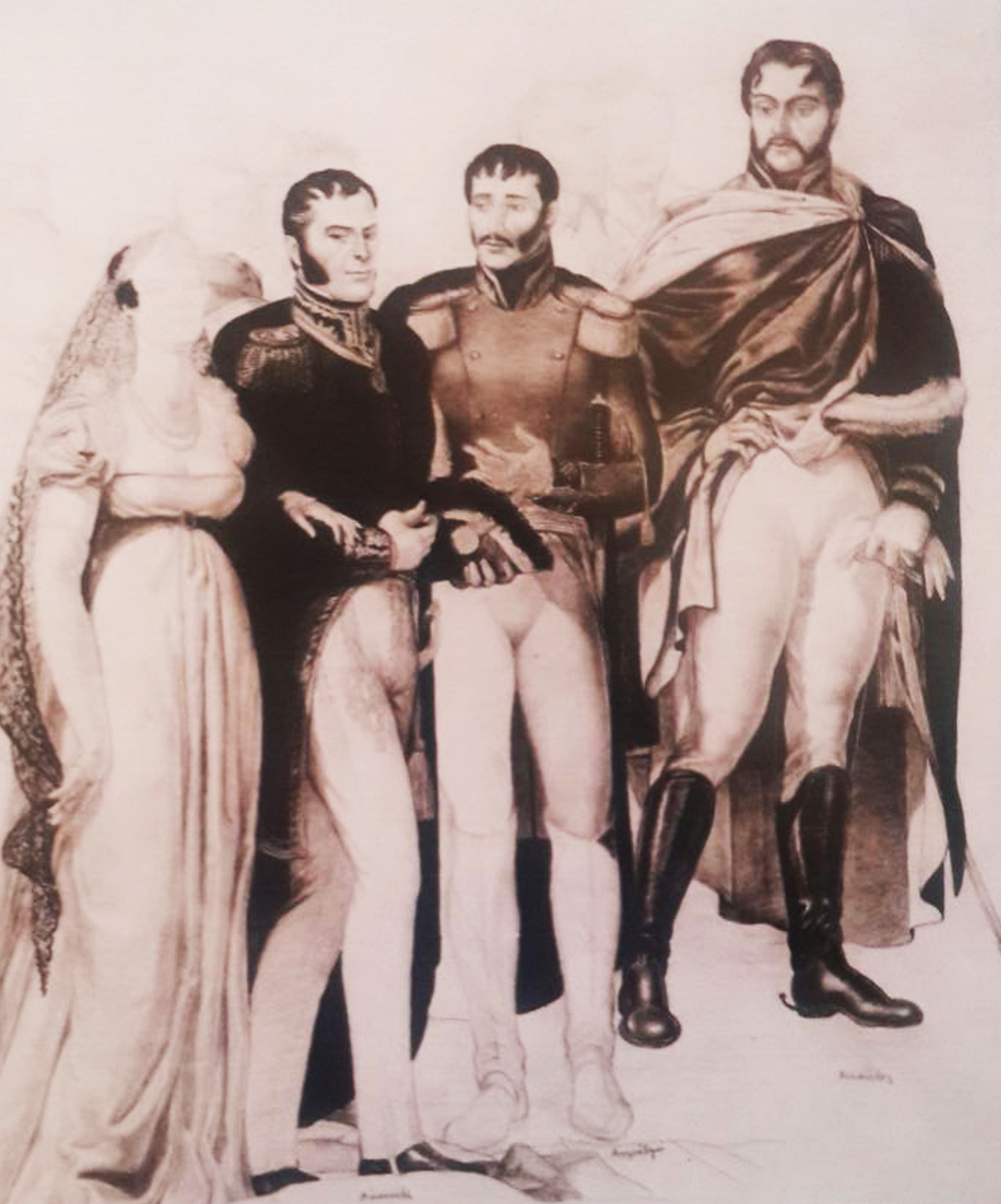 | Los Próceres, de Pedro Centeno Vallenilla. De izquierda a derecha: Luis Cáceres y Juan Bautista Arismendi, José Antonio Anzoátegui y José Francisco Bermúdez. |